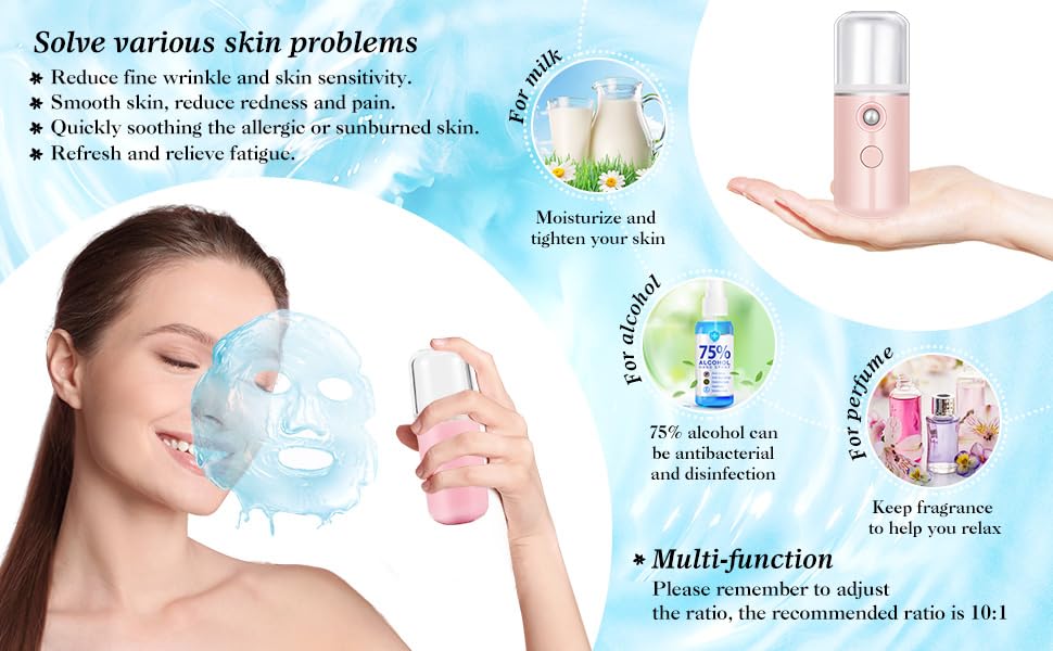 - سهل الحمل: يتميز منتجنا بصغر حجمه وسهولة حمله، حيث توفر لك آلة العناية بالبشرة بمنفذ USB الراحة أثناء التسوق أو السفر أو رحلات العمل، ويمنحك شعورًا بالانتعاش والراحة في أيام الصيف الحارة، كما يحافظ على ترطيب بشرتكِ في الشتاء.