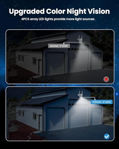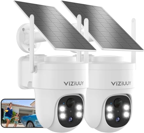 VIZIUUY - كاميرات مراقبة خارجية لاسلكية من فيزيوي، تعمل بالطاقة الشمسية 3MP بخاصية إمالة 360 درجة مع رؤية ليلية ملونة/مستشعر PIR وصوت ثنائي الاتجاه/اليكسا/مساعد جوجل - عبوة من 2 قطعة