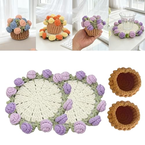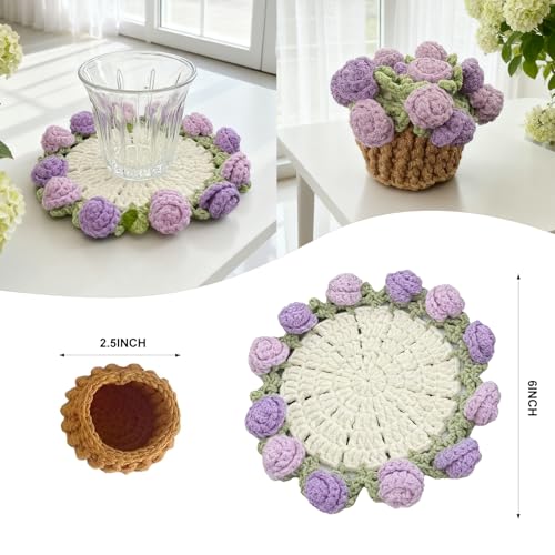 WhimsyHome - قواعد أكواب كروشيه زهور مع سلة، قاعدة أكواب تصميم باقة ورد يدوية الصنع، مفارش مشروبات زهرية زخرفية للمنزل وطاولة القهوة وعيد الميلاد وعيد الأم، 2 قطعة (أرجواني)