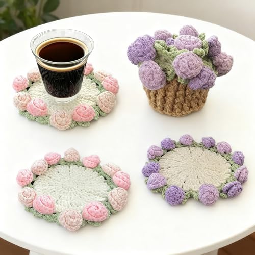 - أكثر من مجرد قواعد أكواب — ينفتح هذا الطقم ليتحول إلى بطانية زهور كروشيه جميلة ويلف ليصبح باقة ورد مذهلة، مما يضيف الدفء والسحر لأي غرفة.
