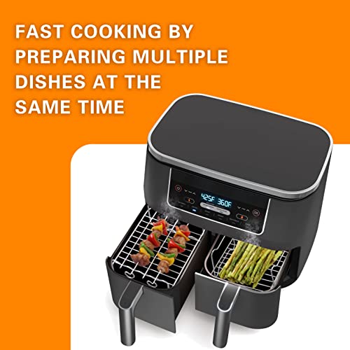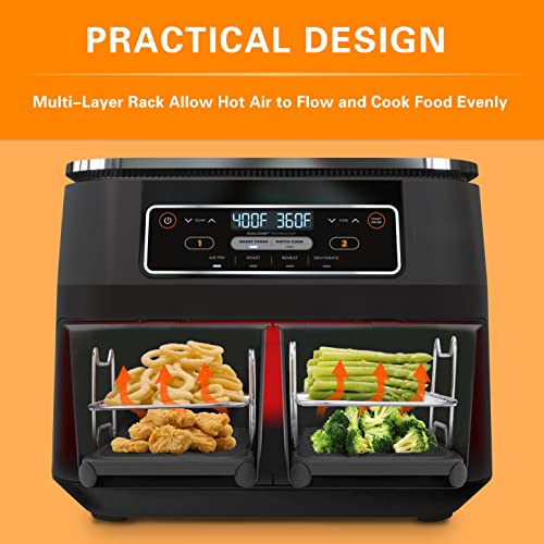 - يمكن استخدامها على نطاق واسع - كأداة مطبخ عملية، يمكن استخدام رفوف المقلاة الهوائية المزدوجة للكباب والبيتزا المقرمشة والدجاج واللحوم والمأكولات البحرية والخضروات وأكثر من ذلك. علاوة على ذلك، فهي هدية مثالية للعطلات للأصدقاء والعائلة الذين يحبون استخدام المقالي الهوائية.