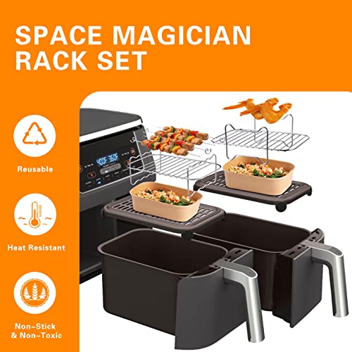 - سحر الفضاء - تأتي كل مجموعة من ملحقات ملحقات المقلاة الهوائية مع 2 رف مقلاة هوائية و4 أسياخ. يمكن للهيكل الفريد تقسيم السلتين إلى 4 مساحات مستقلة. وهذا يعني أنه يمكنك القلي والتحميص وإعادة التسخين والتجفيف على الأقل 4 حصص في نفس الوقت. وفر الوقت والمساحة!
