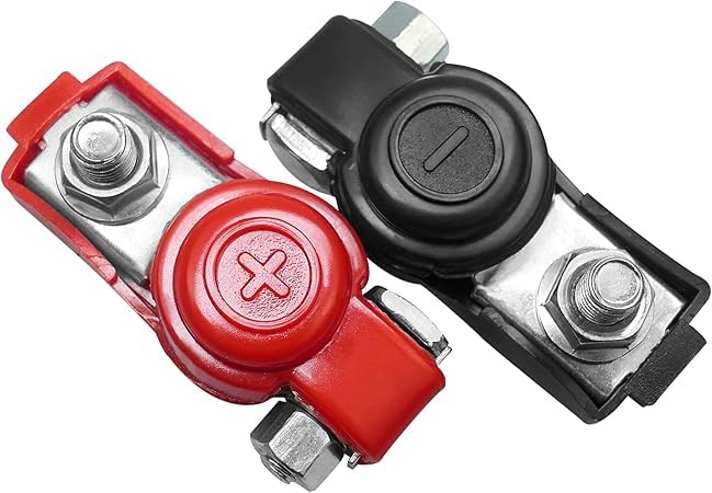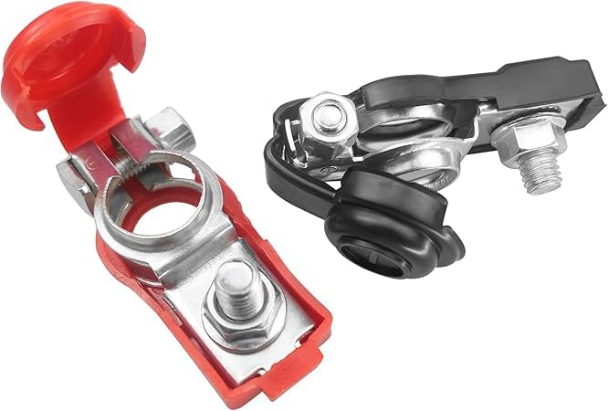 - محتويات العبوة: موصل طرفي سالب للبطارية بلون أحمر، وموصل طرفي موجب للبطارية بلون أسود