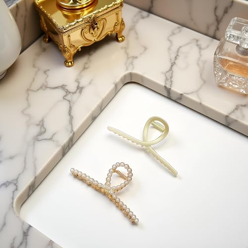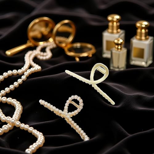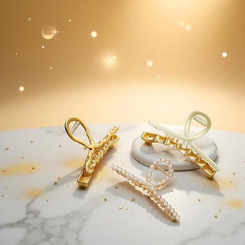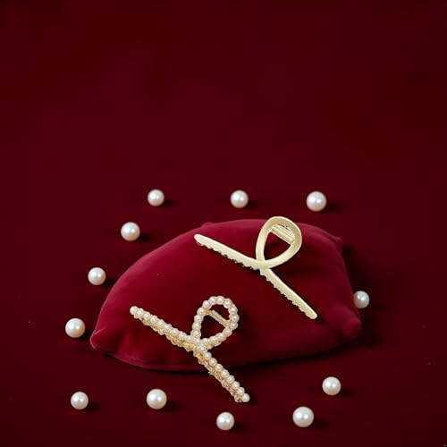 Jizlan - مشابك شعر معدنية كبيرة للنساء من قطعتين - ذهبي غير لامع مع لؤلؤ، مشابك شعر سميكة غير قابلة للانزلاق، مشابك شعر قوية ولامعة، اكسسوارات شعر للشعر الطويل