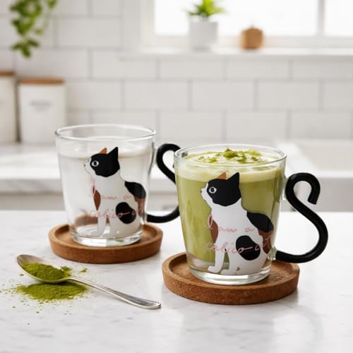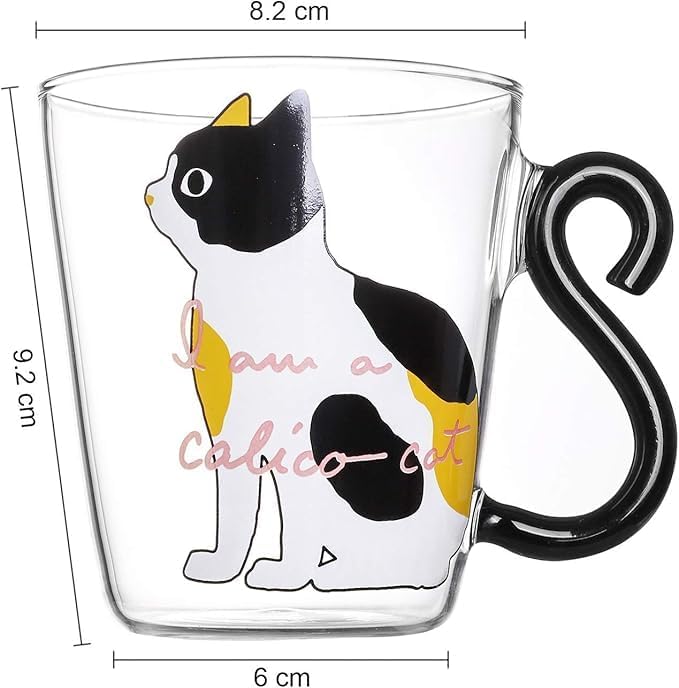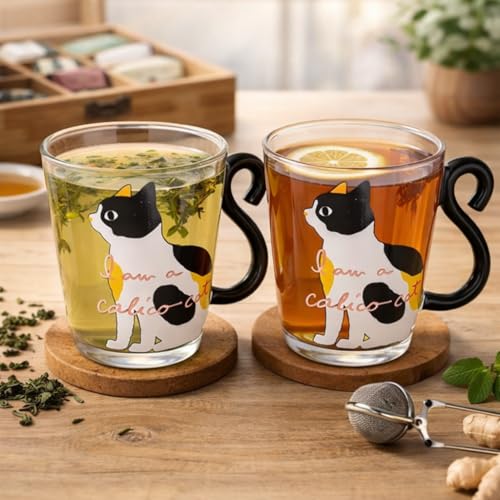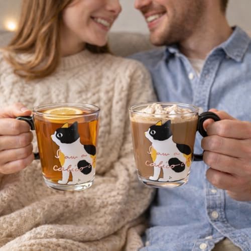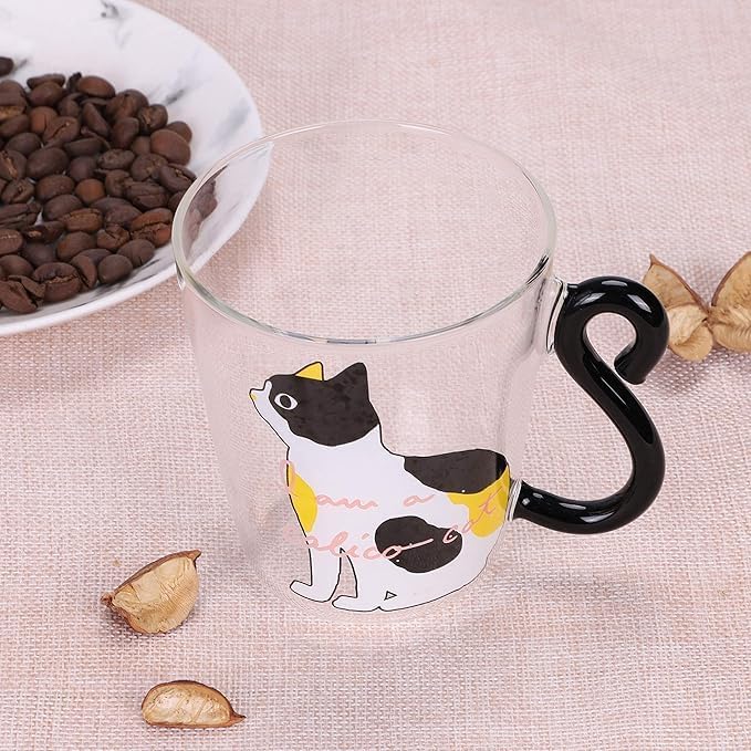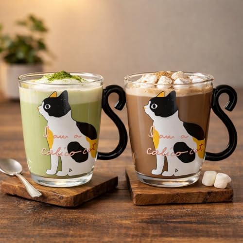 Generic - طقم مجات زجاج شفاف لطيف على شكل قطة بمقبض على شكل ذيل قطة، تصميم قطة كاليكو جذاب وفريد ومتعدد الأغراض لجميع المشروبات، هدية مثالية لعشاق الحيوانات الأليفة، للمنزل والمكتب، قطعتان