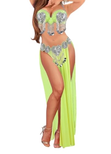generic - بدلة رقص شرقي للنساء من قطعتين مقاس يناسب جميع الالوان بلون ليموني مع خرز مصنوع يدويا بلون فضي، مقاس واحد