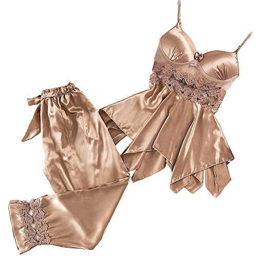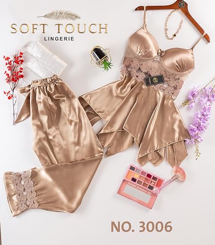 Soft Touch Lingerie - طثقم لانجري مكوّن من 2 قطع بنطال و تفريعة توب بدون أكمام, بيجامة حريمي صيفي بأطراف دانتيل حرير للنساء مقاس واحد من50كيلو إلى 80كيلو (NO:3006)
