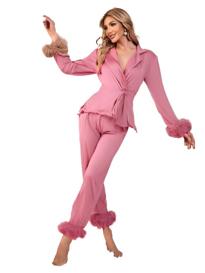 GAMAL SONS FOR ABAYA - طقم بيجامة لانجري من قطعتين من الساتان والدانتيل والشيفون للعبايات (GS-) 0184بيرنت (كشمير)