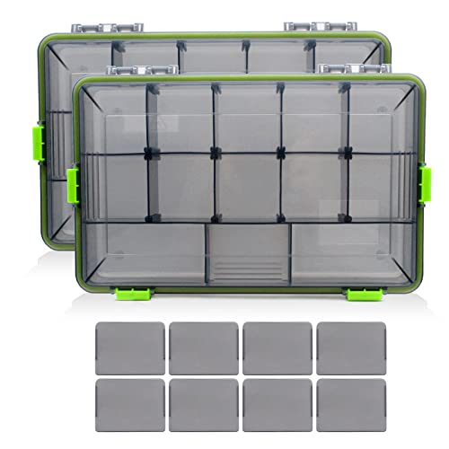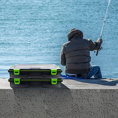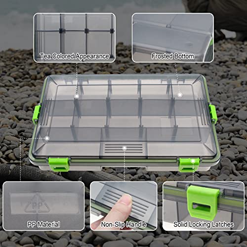 FREGITO - صندوق أدوات صيد السمك من قطعتين، صندوق تخزين من البولي بروبيلين، منظم صناديق أدوات صيد مع فواصل قابلة للإزالة، صواني تخزين رمادية شفافة لطعوم الصيد والخطافات والثقالات، 27 × 15.7 × 5 سم