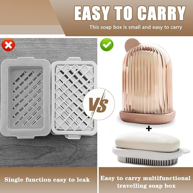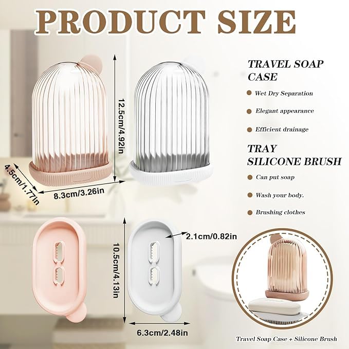 - 【حافظة صابون للسفر 2 في 1】علبة الصابون هذه للسفر هي تصميم مزدوج الغرض مع فرشاة سيليكون متعددة الوظائف. الجانب المقعر يمكن أن يضع الصابون ويصرف الماء، والجانب المحدب يمكن أن يغسل الجسم وينظف الملابس. تستوعب علبة الصابون للسفر بسهولة مجموعة متنوعة من الصابون بالحجم القياسي.