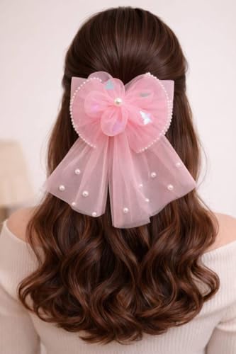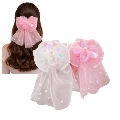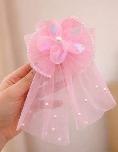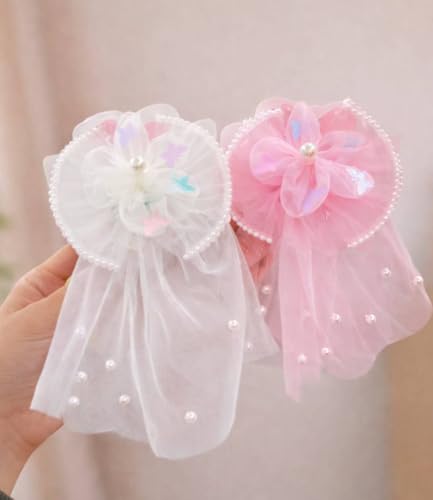 Generic - مشبك شعر بفيونكة من التول مع لؤلؤ وزهور، إكسسوار شعر أنيق للفتيات من قطعتين