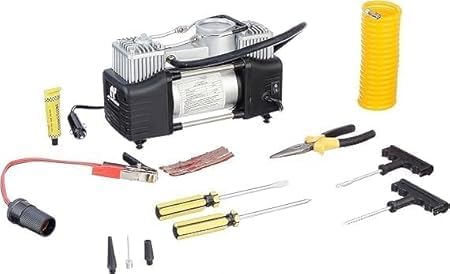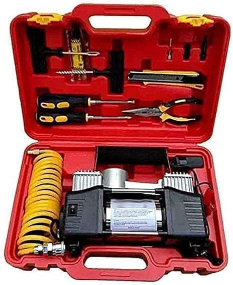 Generic - ضاغط هواء كهربائي بمكبسين مع علبة أدوات الطوارئ، مصدر طاقة مزدوج 12 فولت، يشمل ملحقات التمديد