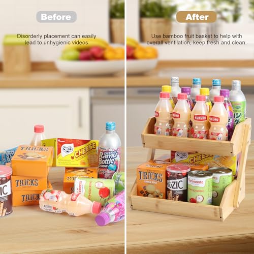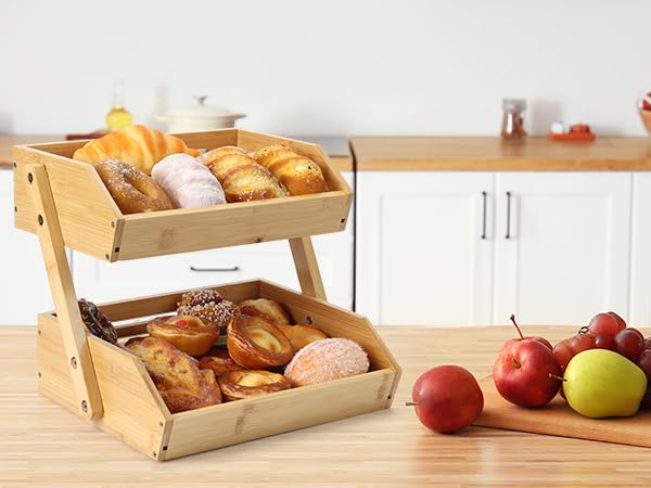 - حامل فاكهة من طبقتين: حامل الفاكهة مصنوعة من الخيزران عالي الجودة، قوي وجميل وثابت دون اهتزاز. حافظ على نضارة فواكهك وخضرواتك مع حامل فواكه من الخيزران الطبيعي جيدة التهوية. على عكس تصاميم المعدن والحديد، يُعدّ حامل الخيزران خيارًا مثاليًا للحفاظ على نضارة الفواكه والخضروات.