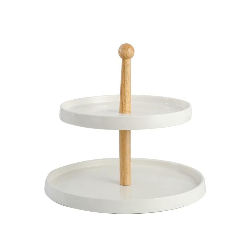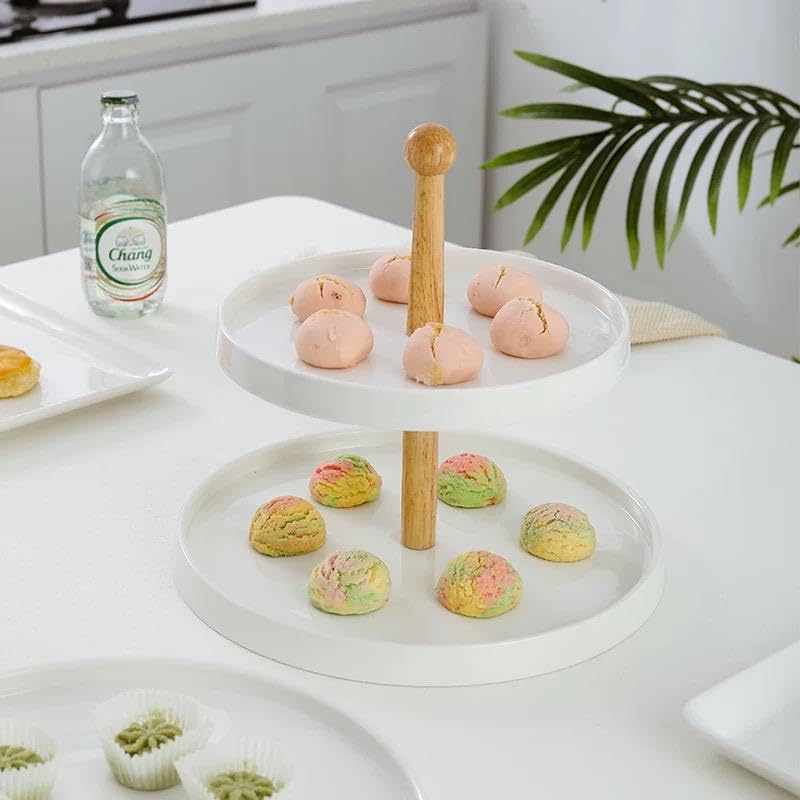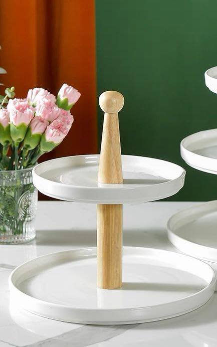 Generic - حامل حلوى من السيراميك بطبقتين، اطباق تقديم بيضاء مع عمود خشبي، تصميم عصري للحلويات والمعجنات