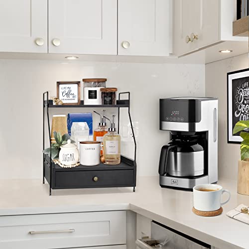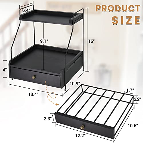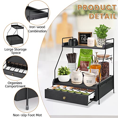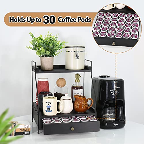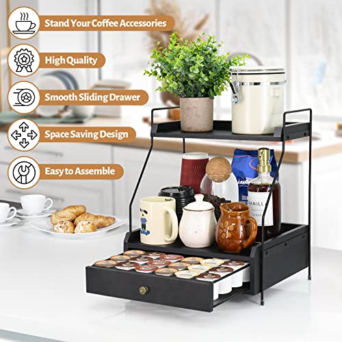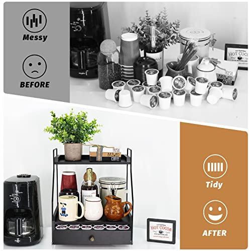 Y&ME YM - منظم قهوة بطبقتين مع حامل اكواب على شكل حرف K، منظم اكواب كيه مع درج لكبسولات القهوة، حامل كبسولات القهوة لتخزين القهوة، مثالي لملحقات بار القهوة وسطح منظم (اسود)