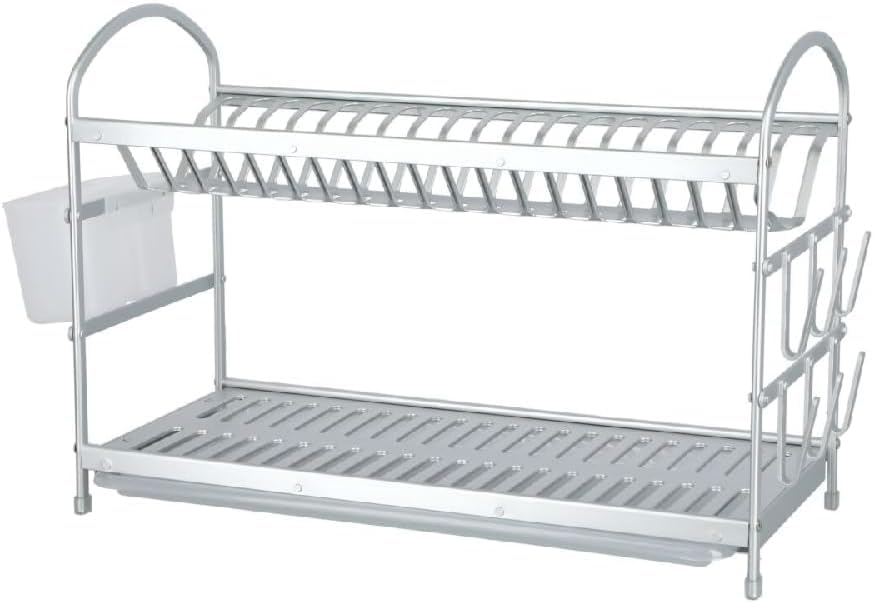 Generic - رف تجفيف أطباق من طبقتين – مصنوع من الومنيوم المتين مع حوامل جانبية وصينية تصريف المياه (L62.9CM*W24CM*H37.7CM)