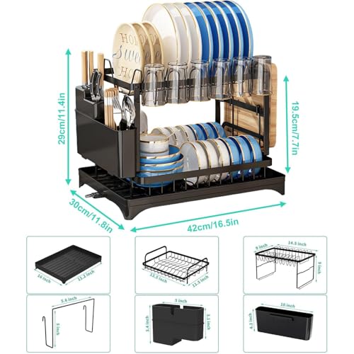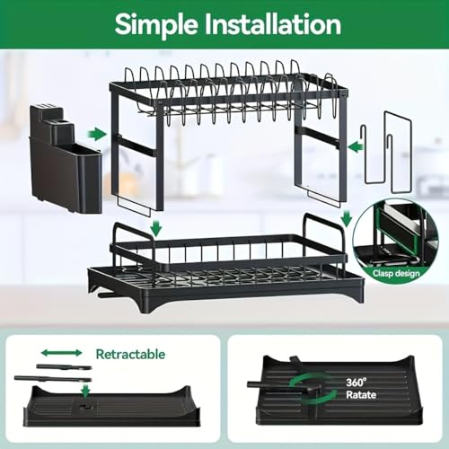 Ouyniei - رف اطباق من طبقتين مع حامل ادوات تناول الطعام والاواني، رف تجفيف اطباق متين من الستانلس ستيل المقاوم للصدا، تخزين مطبخ بسعة كبيرة مع فوهة دوارة 270 درجة، منظم مطبخ قابل للفصل