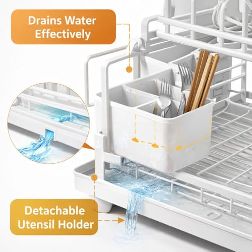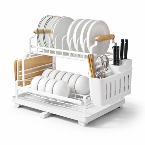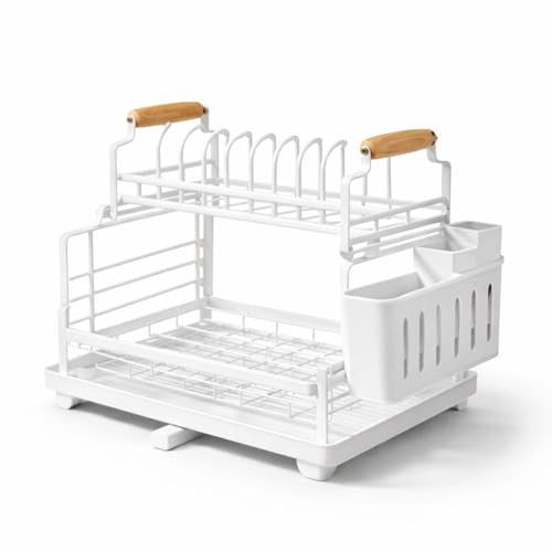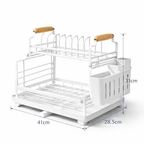 Generic - رف تجفيف اطباق معدني بطبقتين مع لوح تصريف وحامل للاواني، منظم مصفاة اطباق بمقبض خشبي للمطبخ مع رف اكواب وحامل لوح تقطيع، 41 طول × 28.5 عرض × 31 ارتفاع - ابيض