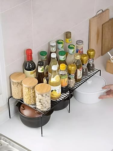 Generic - رف توابل من طبقتين - منظم زاوية سلكي أسود قابل للتوسيع مع صينية تخزين مدمجة، يوفر المساحة ويزيد من تنظيم سطح الطاولة بهيكل معدني أنيق ومتين.