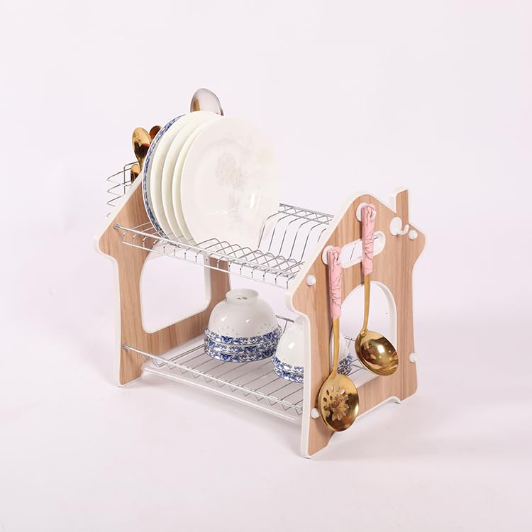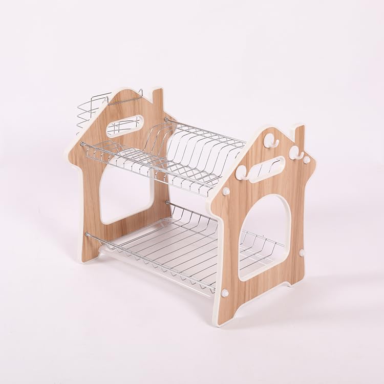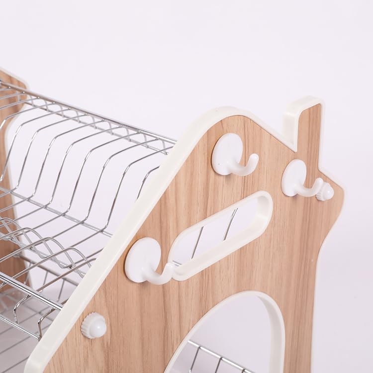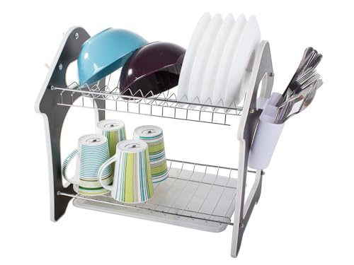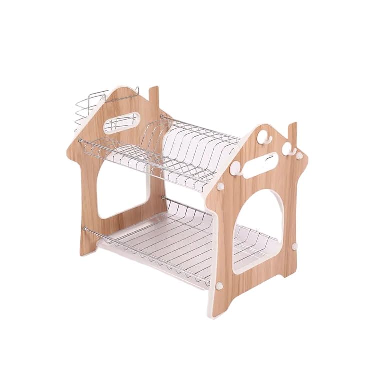 Spaceshoop - صفاية أطباق متينة من الستيل المطلي بالكروم مكونة طبقتين للأواني الفخارية وأدوات المائدة وحامل منظم صينية تنقيط بلون بيج بلاستيك سبيكة صلب