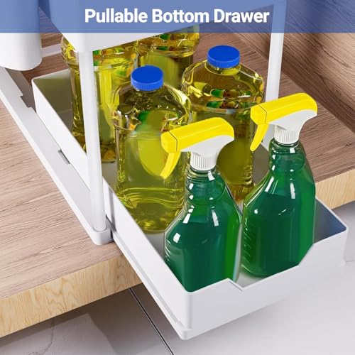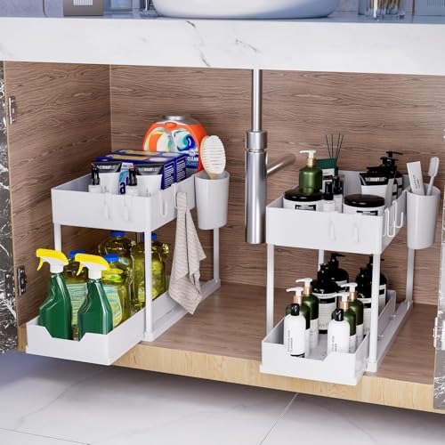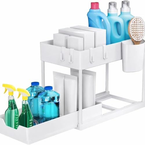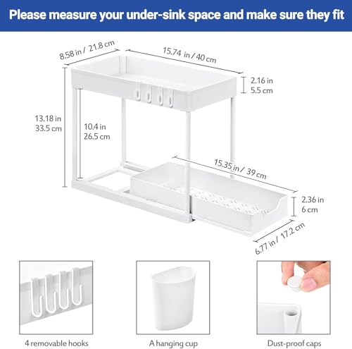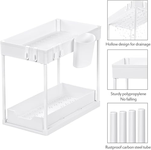 Generic - منظم تخزين ومنظم اسفل الحوض من طبقتين، سلة متعدد الاغراض اسفل الحوض مع 4 خطافات، معلق للحمام والمطبخ (ابيض)