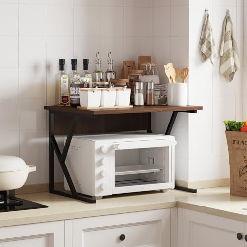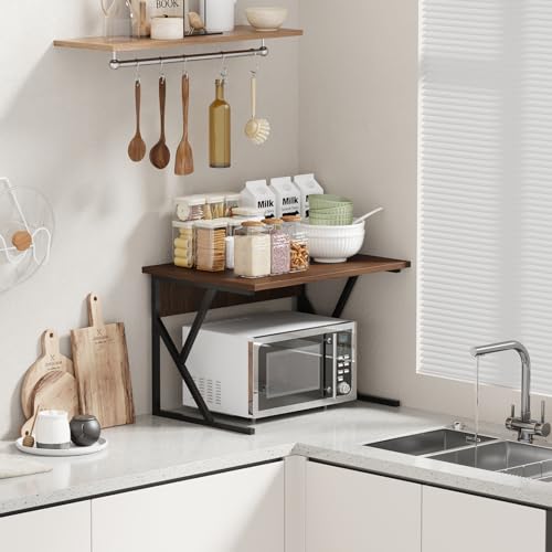 Menaka - رف فرن ميكروويف من 2 طبقات، رف تخزين قائم بذاته بإطار من المعدن مع سطح من الخشب للمطبخ وسطح الطاولة وسطح المكتب