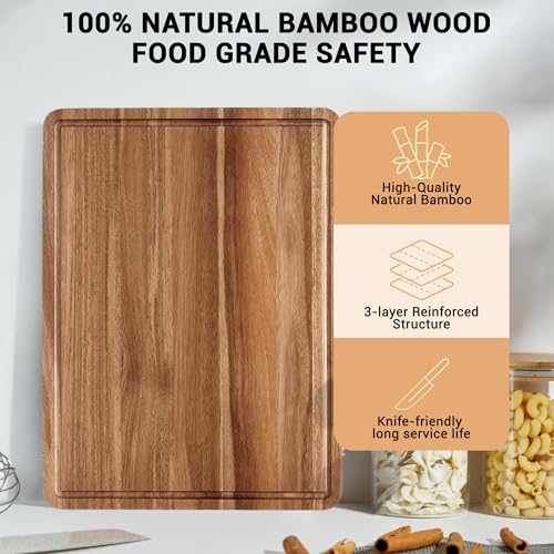 - متانة خشب الأكاسيا الممتاز: مصنوع من خشب الأكاسيا الطبيعي بنسبة 100%، يوفر لوح التقطيع الخشبي المتين هذا قوة معالجة بدرجة حرارة عالية: +55% قوة انثناء، -50% من التشقق والاعوجاج، ومتانة +3x. ، مما يضمن أداءً يدوم طويلاً كلوح تقطيع خشبي كبير موثوق به.