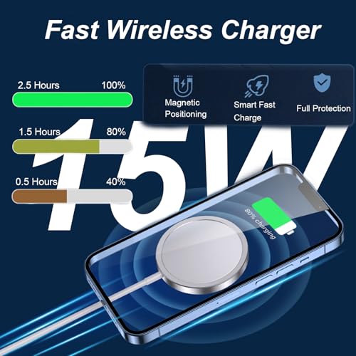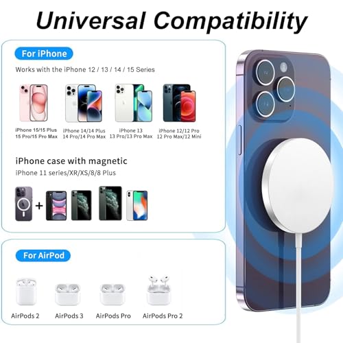 - 【توافق مثالي】هذا الشاحن اللاسلكي المغناطيسي متوافق تمامًا مع ايفون 15/15 برو/15 برو ماكس/15 بلس/14/14 برو/14 برو ماكس/14 بلس/13/13 برو/13 برو ماكس/13 برو ماكس/13 ميني/12/12 برو/12 برو ماكس/12 ميني والموديلات الأخرى، وهو مناسب أيضًا إيربودز 3/2 وسماعات ايربودز برو 2 وحافظات الموبايل المغناطيسية الرسمية.