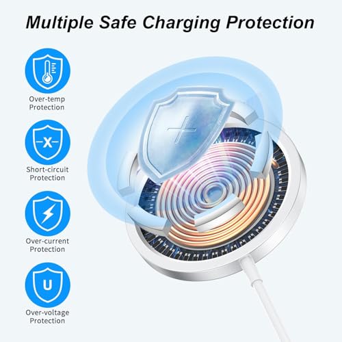 - 【شحن آمن】يتميز الشاحن اللاسلكي المغناطيسي بتقنية حماية ذكية فريدة متعددة الوظائف، مما يوفر التحكم في درجة الحرارة والحماية من التيار وحماية من ماس كهربائى. يمكنه حماية هاتفك من ارتفاع درجة الحرارة، وتحسين عمر بطارية موبايلك، ويوفر لك تجربة شحن وبيئة شحن أفضل وأكثر أمانًا.