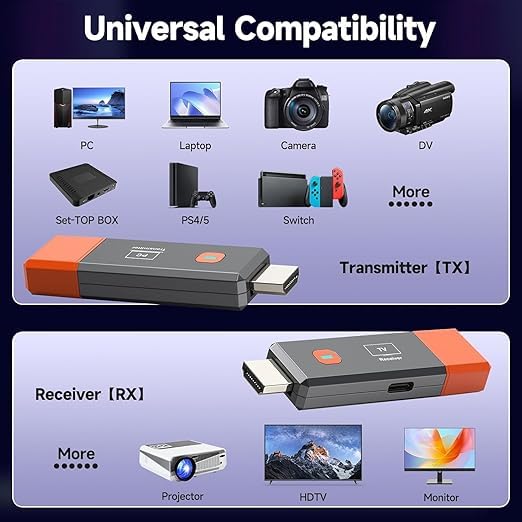 - جهاز ارسال واستقبال HDMI لاسلكي مطور 2025، فك تشفير 4K 165 قدم/50 متر، مجموعة موسع HDMI لاسلكي 1080 بيكسل 2.4G/5G لسطح المكتب والكمبيوتر وتي في بوكس وبلاي ستيشن 5/4 الى التلفزيون/الشاشة/جهاز العرض