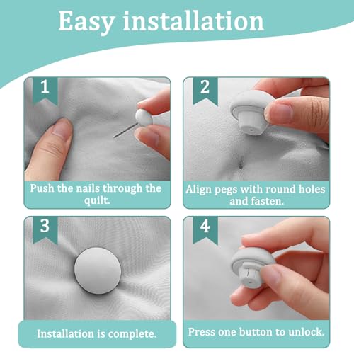- 【سهلة الاستخدام】تحتاج دبابيس اللحاف الخاصة بنا فقط إلى وضع الإبرة في اللحاف وإدخال الظفر في الفتحة المستديرة في الطرف الآخر لتثبيتها. إذا كنت ترغب في إزالة مشبك اللحاف، فأنت بحاجة إلى الضغط على الزر لفتحه، وهو مريح جدًا في الإزالة.