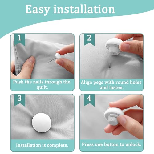 - 【سهلة الاستخدام】تحتاج دبابيس اللحاف الخاصة بنا فقط إلى وضع الإبرة في اللحاف وإدخال الظفر في الفتحة المستديرة في الطرف الآخر لتثبيتها. إذا كنت ترغب في إزالة مشبك اللحاف، فأنت بحاجة إلى الضغط على الزر لفتحه، وهو مريح جدًا في الإزالة.