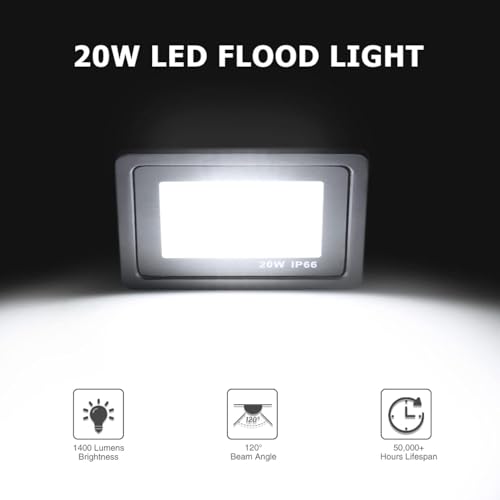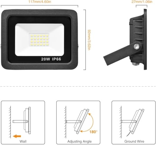 - قوة الإضاءة: كشاف LED بقوة 20 واط يوفر 1000 لومن من الإضاءة الساطعة البيضاء الباردة بدرجة حرارة 6500 كلفن