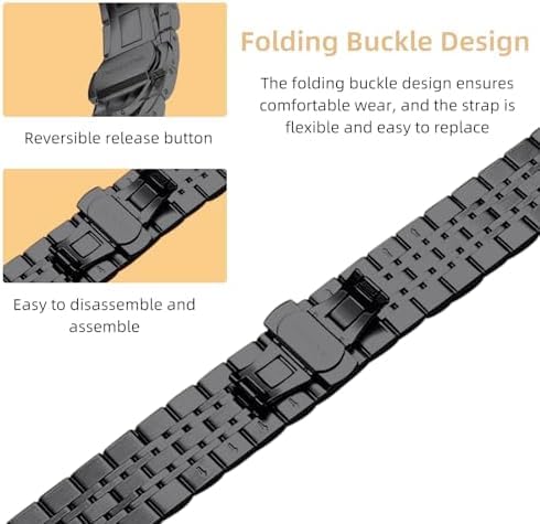 - مقاس قابل للتعديل: مناسب للمعصم بمحيط 13 سم حتى 18 سم. يرجى ملاحظة أن هذا لا يشمل مقاس الساعة. يأتي السوار مع أداة إزالة تسمح لك بضبط طول السوار بنفسك. وهذا يعني أن السوار يناسب المعصم تمامًا ويمنع المشاكل الناجمة عن وقت الارتداء الطويل جدًا أو القصير جدًا. تصميم مشبك إغلاق سريع الفك يجعل الأمر أسهل ويسرع من ارتداء الساعة وخلعها.
