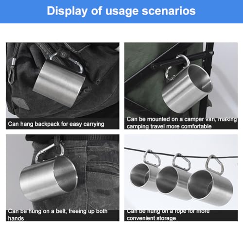 - مريحة للحمل: مقبض كوب التخييم مع قفل للتسلق، خفيف الوزن وصغير الحجم، عملي ومتين، يمكن تعليقه على حقيبة الظهر وسلسلة المفاتيح وسهل الحمل.
