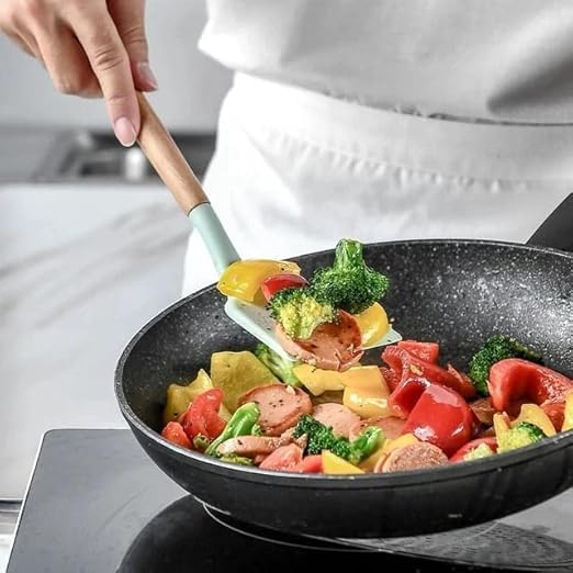 Generic - طقم توزيع سيليكون مقاوم للحرارة بدرجة حرارة 230 درجة مئوية يتضمن مساكة طعام من ملعقة سباتولا وملعقة وفرشاة وخفاقة بمقابض خشبية لأواني الطبخ المقاومة للالتصاق