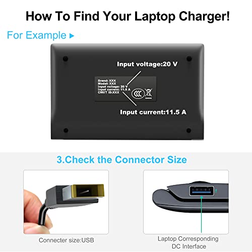 - الإدخال: 100-240 فولت 50-60 هرتز؛ الإخراج: 20 فولت 11.5 أمبير 230 واط (متوافق مع 170 واط 150 واط 135 واط 120 واط)؛ الاتصال: موصل USB أصفر مربع
