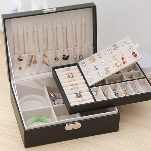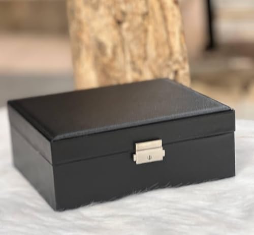 AREXOL - علبة تنظيم المجوهرات والاكسسوارات الجلدية بمفتاح دورين لتخزين السلاسل والخواتم والأساور مقاس 23 سم تصميم عملي أنيق لحماية المجوهرات في المنزل والسفر
