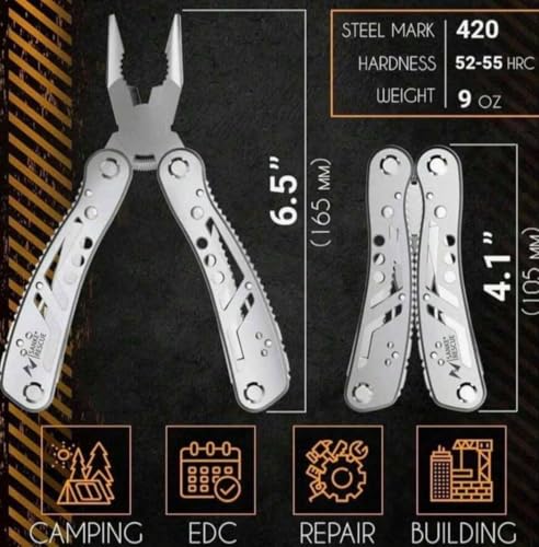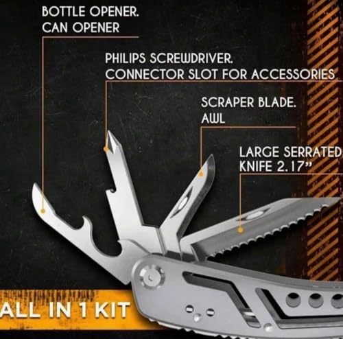 - أدوات متعددة شاملة: كماشة قابلة للطي من الستانلس ستيل 24 في 1 تجمع بين الأدوات الأساسية بما في ذلك الكماشة العادية وقواطع الأسلاك وشفرات السكاكين والمنشار والمبرد ومفك البراغي وفتاحة الزجاجات وفتاحة العلب للاستخدام الخارجي متعدد الاستخدامات