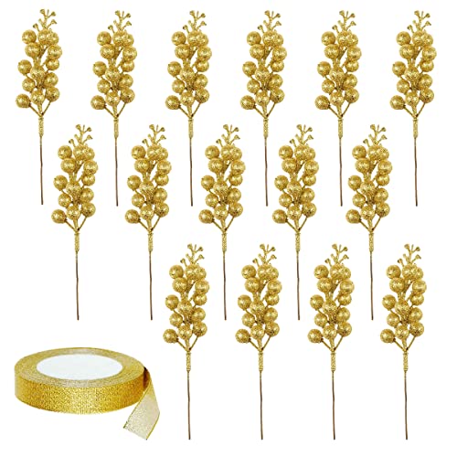 generic - 24 قطعة من سيقان التوت الذهبية اللامعة، سيقان التوت اللامعة للكريسماس، سيقان التوت الصناعي مع شريط لتزيين حفلات الكريسماس والعطلات والذكرى السنوية (ذهبي)