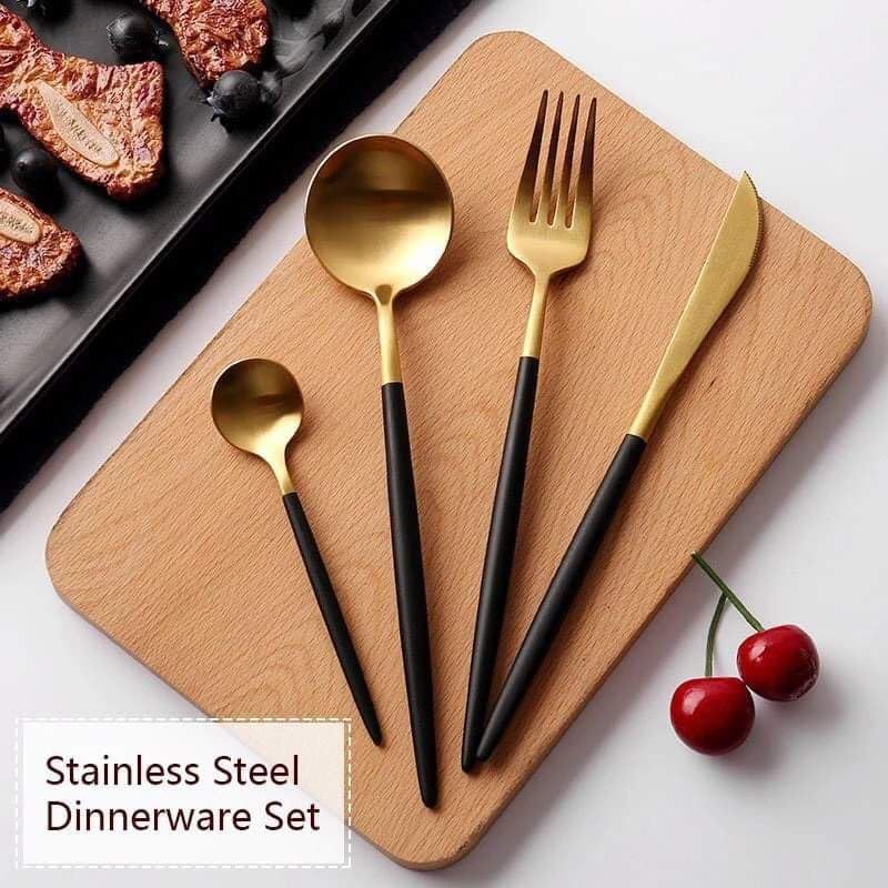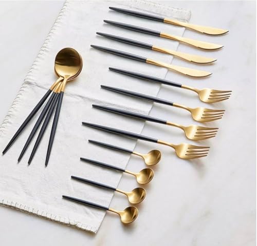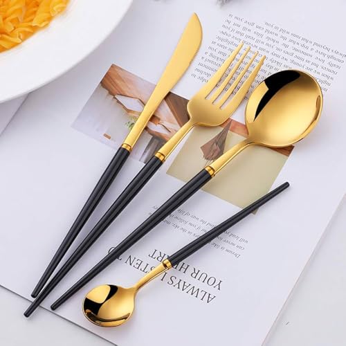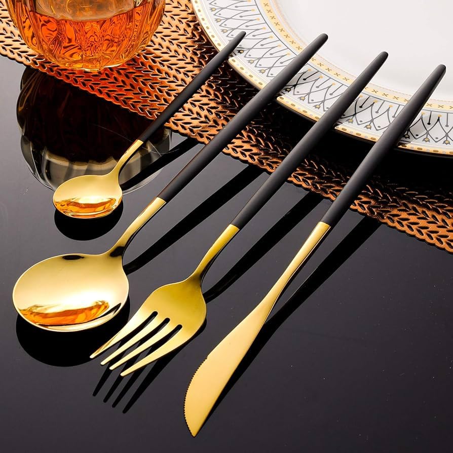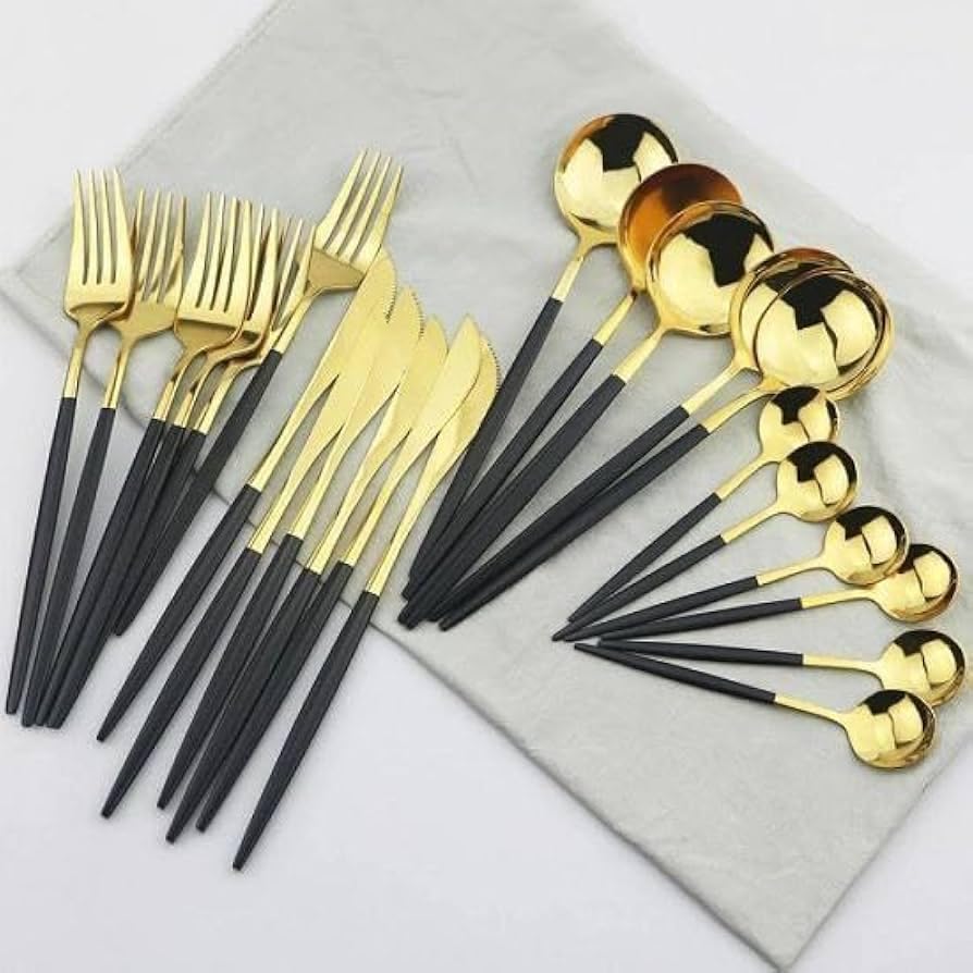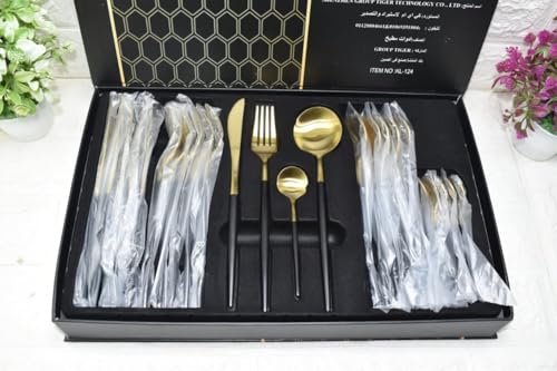 Generic - طقم أدوات مائدة من الفولاذ المقاوم للصدأ بلمسة نهائية عاكسة ومصقولة بلون ذهبى أنيق وعصري مكون من 24 قطعة( معالق وشوك وسكاكين ) لـ 6 أشخاص لون ذهبي فخم × أسود مطفي = أناقة تخطف الأنظار