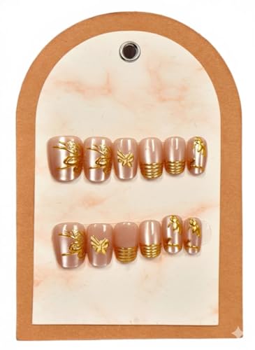 Generic - أظافر صناعية جاهزة، لون بني وردي مع ذهبي، تصميم فراشة وخطوط، 24 قطعة، أظافر قابلة للضغط