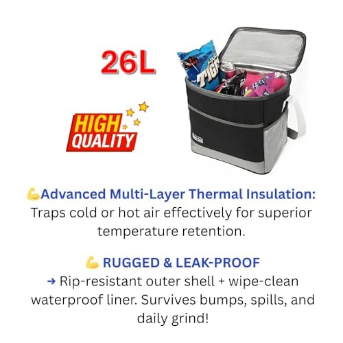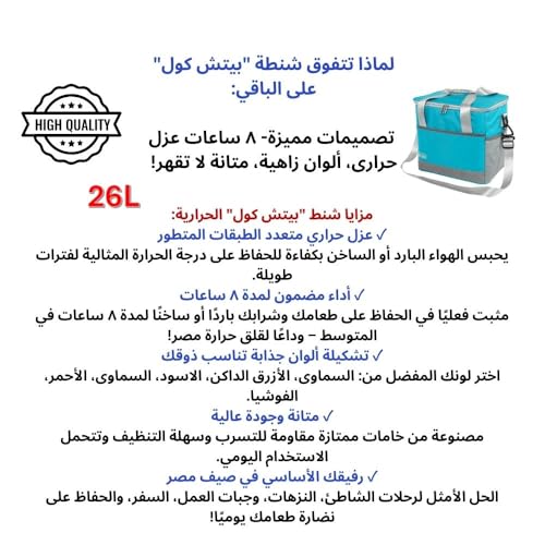 - 👜 جاهزة للمغامرة طوال اليوم: السعة الواسعة 26 لتر تستوعب وجبات الغداء للعمل، أو مأكولات النزهات، أو وجبات خفيفة للشاطئ، أو مستلزمات السفر.