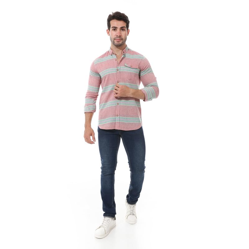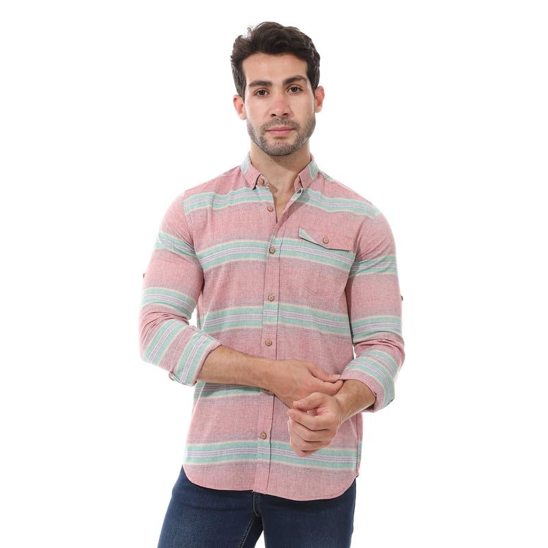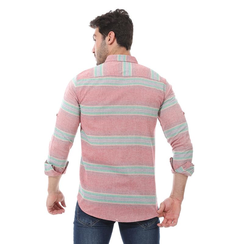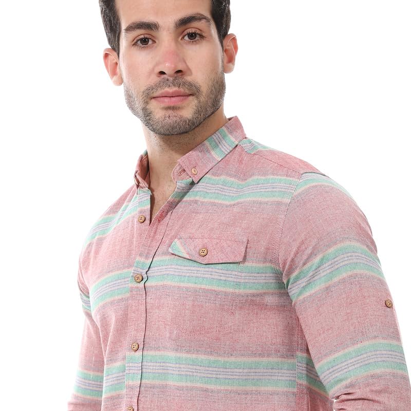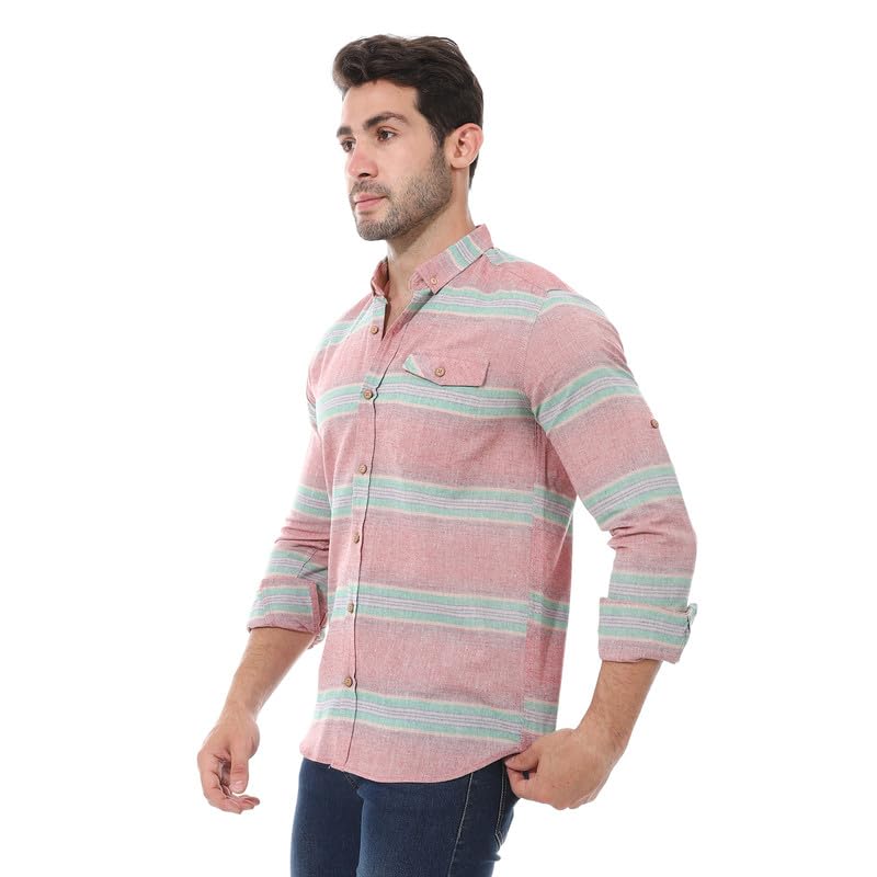 2B Stylish - قميص كاجوال انيق مخطط باكمام مطوية من مزيج القطن من تو بي - احمر