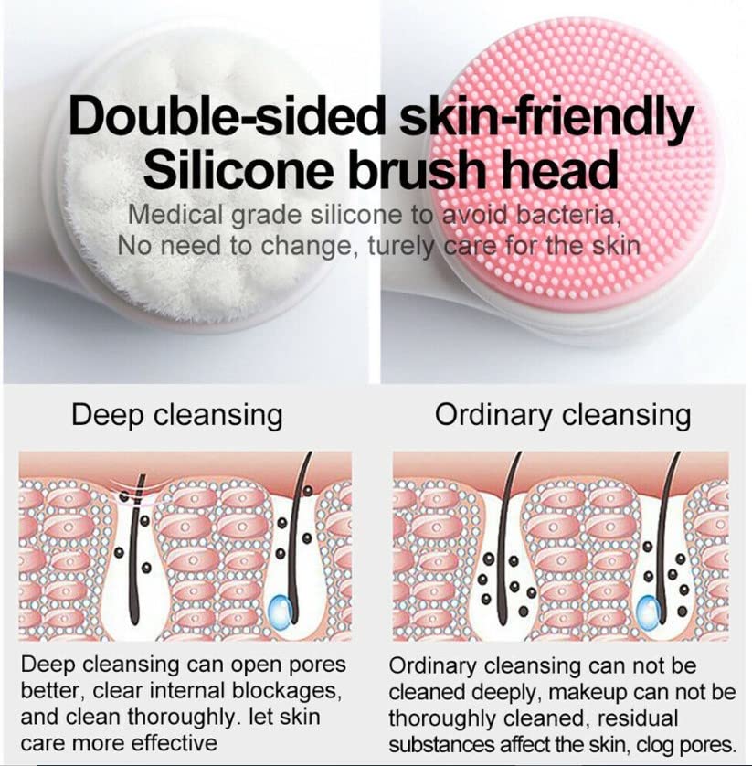 - رأس تنظيف واحد ينظف البشرة ورأس التدليك يزيل الجلد الميت. الجانب الآخر مصنوع من السيليكون الآمن غذائيًا، ويدلك وجهك، وينشط الدورة الدموية في الوجه، ويعزز تجديد الخلايا.
