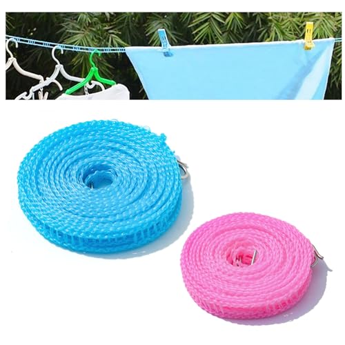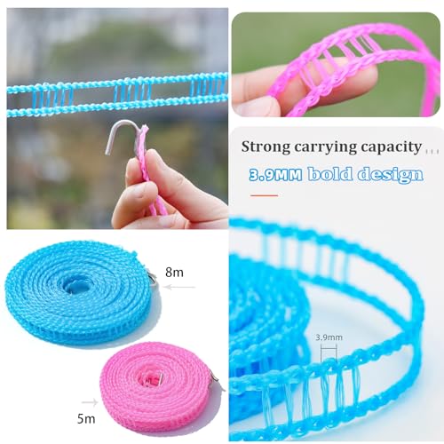 Gouccpu - حبل غسيل ملابس مقاوم للرياح، حبل غسيل من النايلون غير قابل للانزلاق، حبل تجفيف ملابس محمول للسفر، حبل غسيل قابل للتعديل للتخييم في الهواء الطلق والمنزل والفندق (5 متر زهري + 8 متر ازرق)