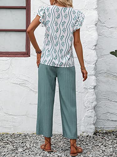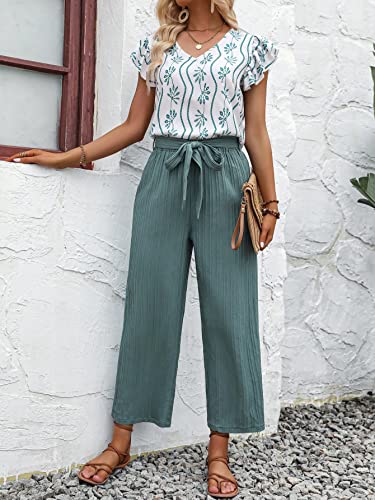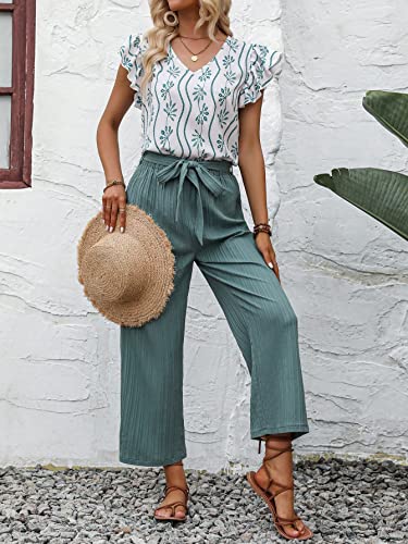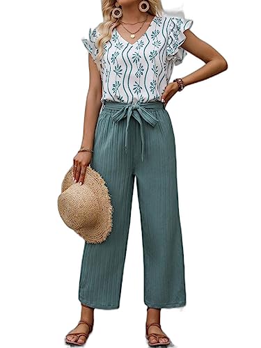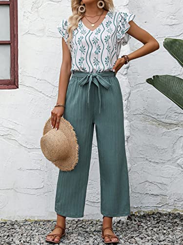 SHEIN - طقم ملابس من توب مكشوف الكتفين بطبعة نباتات وبنطلون بأرجل واسعة حريمي من قطعتين
