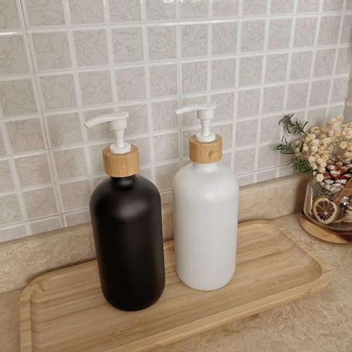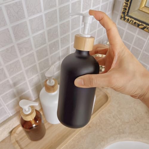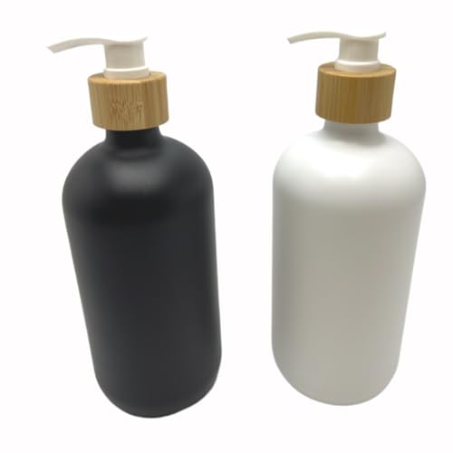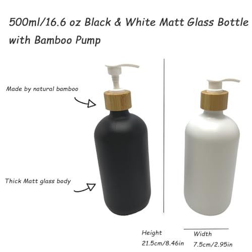 BEECO GIF2U - زجاجات مضخة زجاجية فارغة قابلة لاعادة الملء سعة 500 مل/16.5 اونصة من قطعتين بلون اسود وابيض غير لامع مع راس مضخة من الخيزران للاستحمام والشامبو وبلسم الشعر والمنظف والمكياج السائل