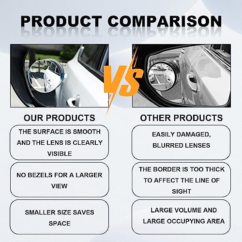 - 【المزيد من الأمان】تتميز مراية النقطة العمياء بتصميم بدون حواف. تزيد الزاوية الواسعة داخل السيارة من مجال رؤيتك. تعمل المراية على زيادة السلامة عبر كشف البقعة العمياء لقيادة أكثر أمانًا عند تخطي السيارات وتغيير الممرات على أي طريق.