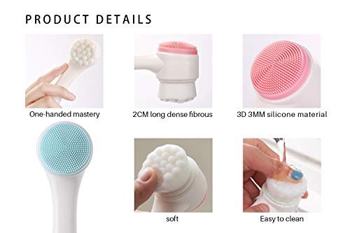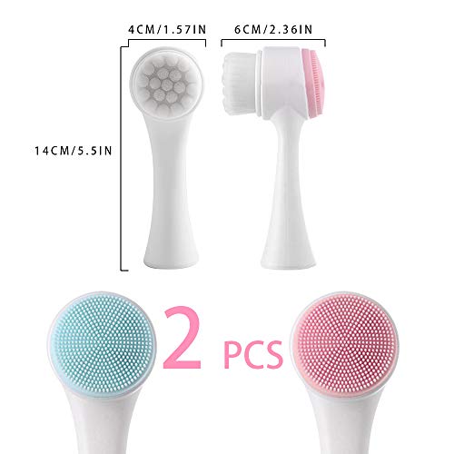 NATURE Ann - فرش تنظيف الوجه اليدوية مزدوجة الرأس بشعيرات ناعمة 2 في 1 وفرشاة تجميل من السيليكون لتنظيف المسام العميقة والتقشير وإزالة الرؤوس السوداء والتدليك، مجموعة من قطعتين (أزرق - وردي)